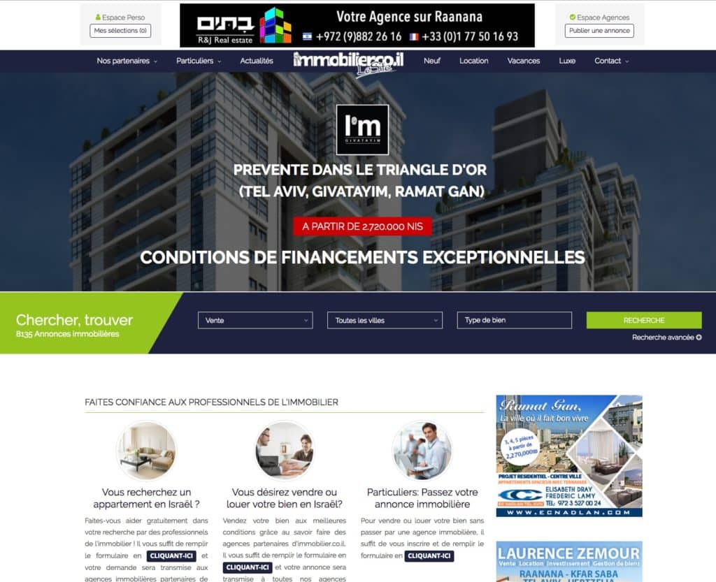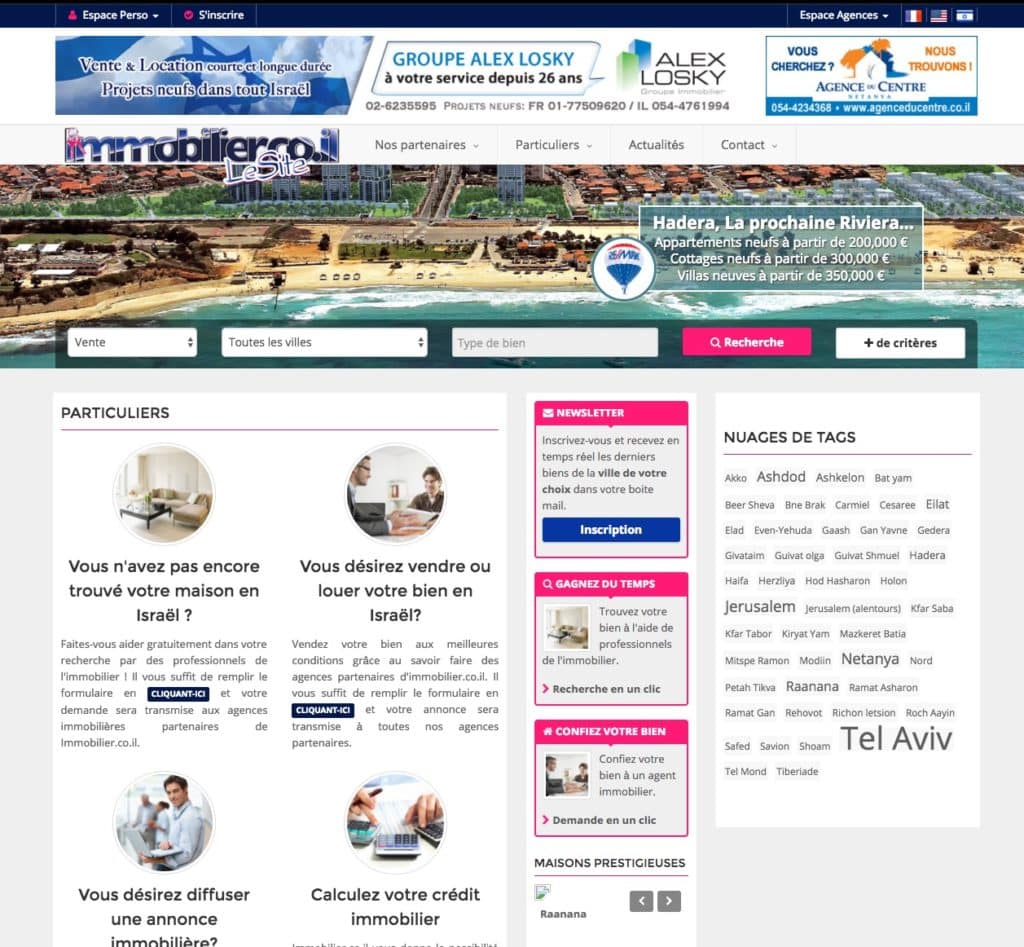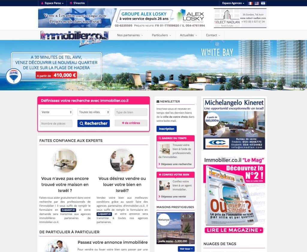 A L’OCCASION DES 10 ANS D’IMMOBILIER.CO.IL: DECOUVREZ LA NOUVELLE VERSION DU SITE avec plein de nouveautés pour les professionnels et pour les visiteurs! Nouvelle charte graphique (modèle responsive, nouvelles couleurs) Nouveau grand slider en haut du site Un moteur de recherche plus “soft”, avec possibilité de recherche avancée, à présent sur toutes les pages! Mise en avant des liens pour les particuliers + Nouvel espace dédié Nouvel onglet “Actualité” avec possibilité aux agences de publier des articles sur l’actualité immobilière en Israël. Mise en avant des partenaires Métiers. Nouvel espace “Bienvenue” pour accueillir les nouvelles agences partenaires Sur les pages internes, apparition d’un “double sidebar” avec tous les accès direct vers les services pour Particuliers: Abonnement newsletter, Actualité, Métiers, Mandats… Et bien sur, tous les avantages liées à la version Responsive qui permettent aux 60% de visiteurs provenant de leur smartphone ou tablette de visionner le site sans aucun problème! Un site plus vivant Des articles sur l’actualité de l’immobilier en Israël, publiés par nos partenaires. Pour publier votre article GRATUITEMENT sur notre portail, cliquez-ici. Une version Responsive Le site s’adapte à tous les formats d’écran. Les agents pourront, à tout moment, accéder à leur Compte Pro et insérer ou modifier leurs annonces depuis leur Smartphone ou tablette ! Un accès facile pour les visiteurs Une mise en avant du moteur de recherche (sur toutes les pages) et un espace privilégié pour les particuliers afin d’augmenter les mandats de vente et de recherche. De nouveaux espaces publicitaires Le site propose de nouveaux espaces publicitaires, idéals pour augmenter votre notoriété ou pour promouvoir votre activité, un projet neuf, un appartement en exclusivité…