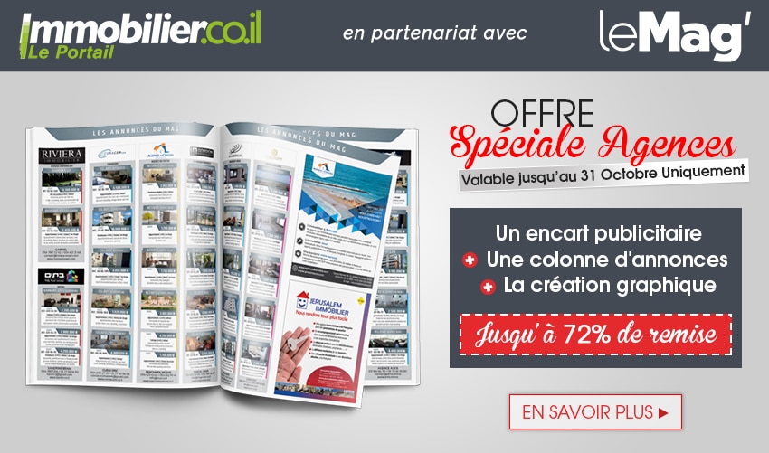 Dès le prochain numéro du Mag’, paraissez dans le “Supplément Immo” à un tarif exceptionnel ! En tant que clients d’immobilier.co.il, vous serez les seuls à bénéficier de cette offre promotionnelle : Un encart publicitaire + Une colonne d’annonces + La création graphique Jusqu’à 72% de remise Pour plus de détails, CLIQUEZ ICI