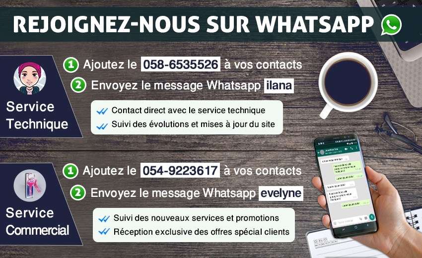 Bonjour à toutes nos agences partenaires. Nouveauté: Contactez-nous plus facilement grâce à Whatsapp ! Pour le service technique: Ajoutez le 058-6535526 à vos contacts Envoyez le message Whatsapp “ilana“ – Contact direct avec le service technique – Suivi des évolutions et mises à jour du site Pour le service commercial: Ajoutez le 054-9223617 à vos contacts Envoyez le message Whatsapp “evelyne“ – Suivi des nouveaux services et promotions – Réception exclusive des offres spécial clients