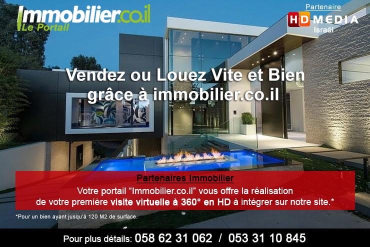 Immobilier.co.il vous propose une nouvelle option, en partenariat avec HD Media, spécialiste de la visite virtuelle à 360°. Il s’agit de la possibilité d’insérer une vidéo 360° dans l’annonce d’un appartement, pour les agences ayant un contrat avec notre nouveau partenaire. Voir un exemple ici. Présentation “HD Media” est une agence française spécialisée dans le media immersif. Notre expertise et notre réseau de professionnels de la communication web par l’image font de nous le spécialiste de la visite virtuelle à 360° de qualité en France, Belgique, Canada, Dom-Tom… Grâce à une méthode de réalisation unique,nous proposons aux professionnels de l’immobilier un service sur mesure répondant à leurs besoins. Fort de notre succès, nous poursuivons notre développement à l’international et notamment en Israël. Partenaire des plus importants sites Francophones (Se Loger, 1001 salles, Expedia, tables & auberges de France, Relais et Châteaux…), nous sommes aujourd’hui partenaire d’Immobilier.co.il pour que vous aussi, professionnels de l’immobilier en Israël, vous puissiez profiter de notre savoir faire ! Pour plus de détails sur ce service, contactez : Yehoshoua: 058 62 31 062 ou Moshé: 053 31 10 845 [email protected]