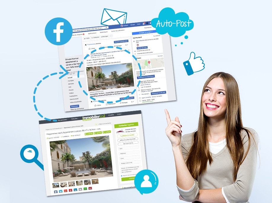 Bonjour à tous! Tous le monde sait que Facebook est aujourd’hui le N°1 des réseaux sociaux et que la présence y est incontournable. En tant qu’agence immobilière, votre page professionnelle Facebook doit maintenir votre lien avec la “communauté” qui la suit. Pour cela, il faut animer votre page et mettre à jour du contenu intéressant et actuel. Nouveau service: Automatic post in your fanpage Facebook Immobilier.co.il vous permet d’animer votre page sans que vous n’ayez rien à faire! Chaque annonce immobilière que vous créez ou actualisez est automatiquement postée sur votre page facebook. Ainsi, votre page professionnelle est toujours animée avec vos nouveaux produits. Pour bénéficier de ce service, il suffit de contacter le service commercial: 054 922 36 17 ou le service technique via Whatsapp au 058 653 55 26 A bientôt