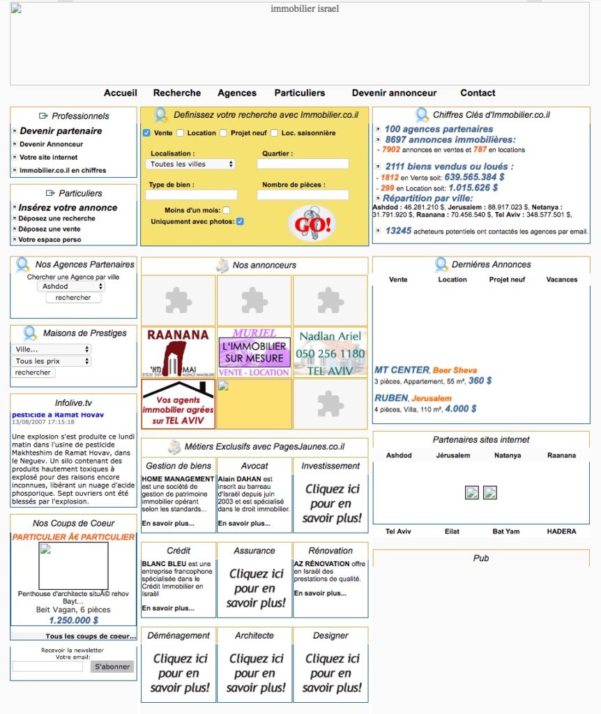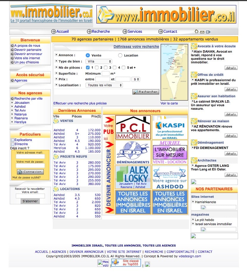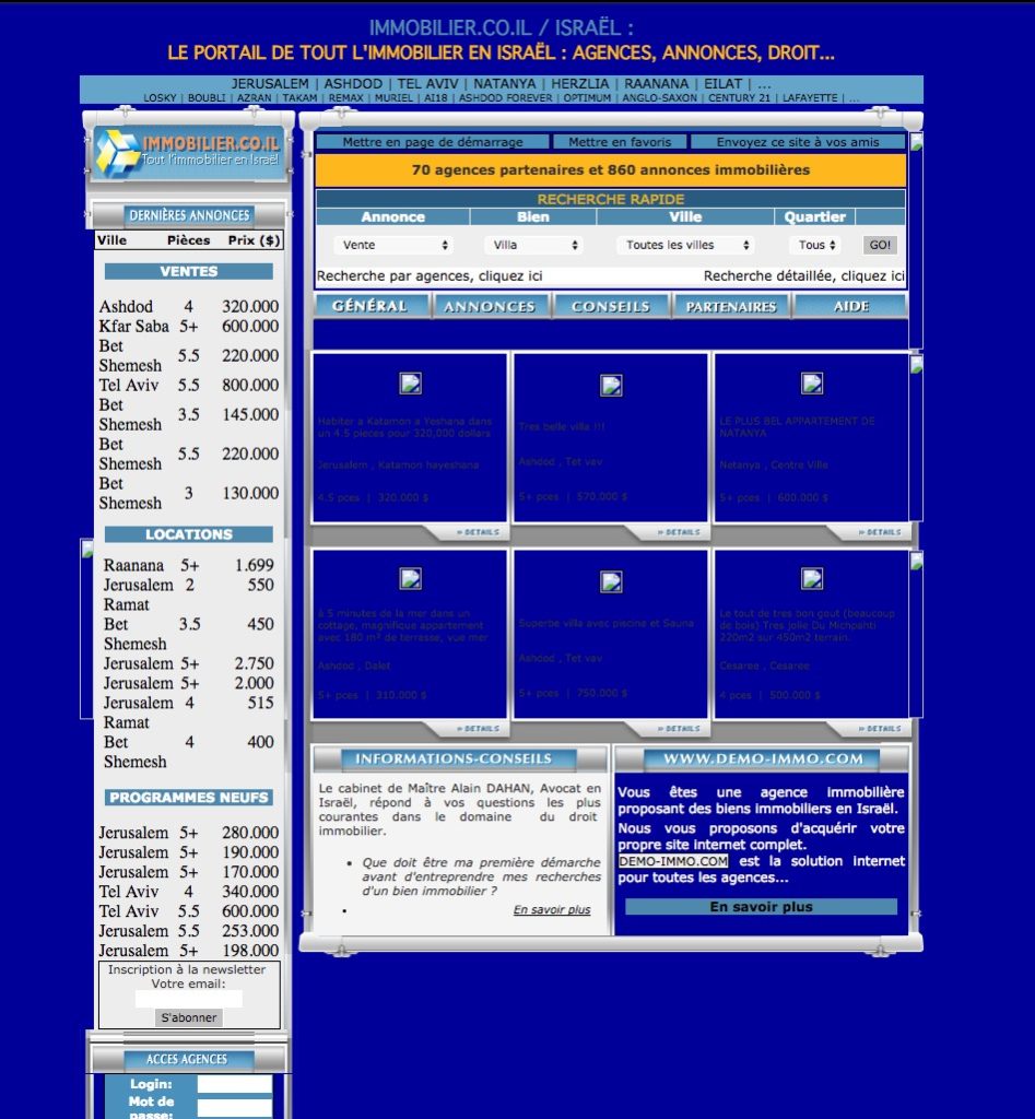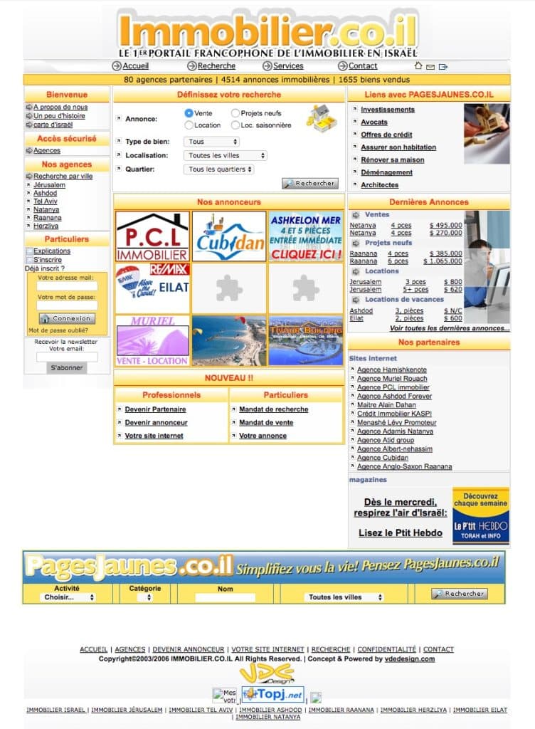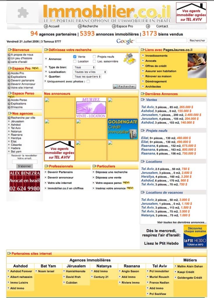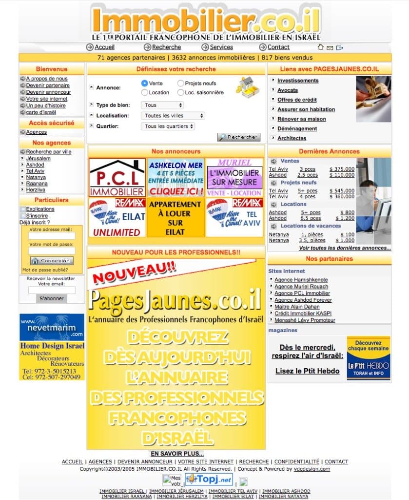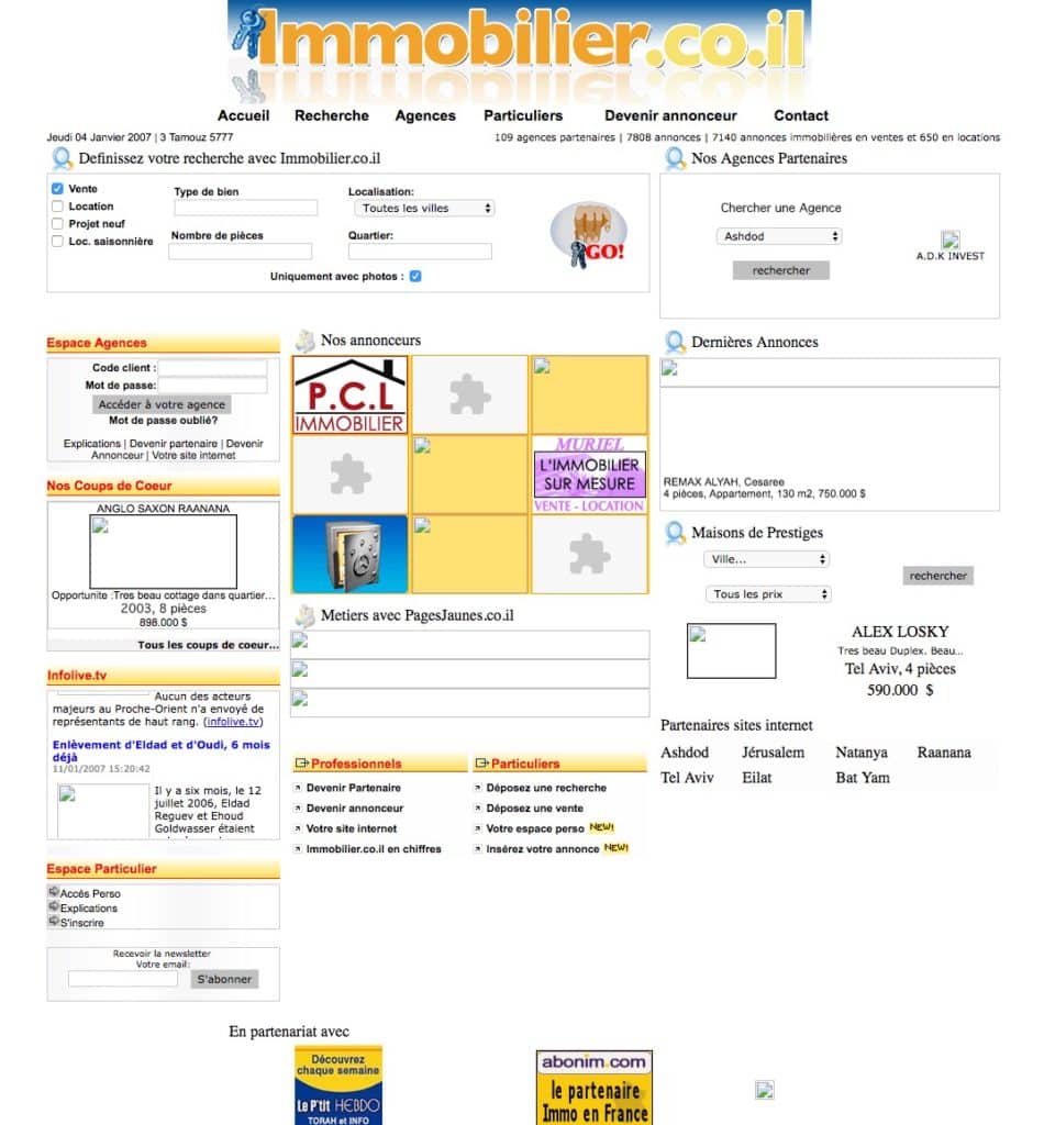 Septembre 2005: Immobilier.co.il compte déjà 7 partenaires internet! Ce sont des sites d’agences ou promoteurs mais aussi de métiers liés à l’immobilier (avocat, crédit) Immobilier.co.il propose déjà un nouveau design pour ces sites internet: encore plus concis et facile d’utilisation pour les internautes!