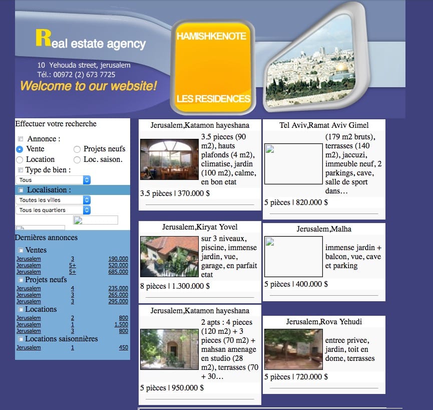 En Mars 2005, Immobilier.co.il sort son premier “site en location” pour son client Hamishkenot: www.azran.co.il Le client n’a pas besoin de travailler 2 fois: Toutes les annonces postés sur immobilier.co.il remplissent simultanément son site internet! Un site immobilier avec son propre nom de domaine pour être présent sur le web et communiquer facilement avec les clients, même à distance! Le site changera de look quelques mois plus tard avec mise en avant de ses annonces en page d’accueil et un menu plus élaboré. Immobilier.co.il fera ensuite évoluer ce site ainsi que les autres sites partenaires au fil des années, sans le moindre coût! Chaque nouveauté technique ou graphique est appliquée pour tous à la fois. Les clients bénéficieront donc de toutes les évolutions liées aux fonctionnalités du site et au monde d’internet en général. En résumé: un excellent atout de travail pour les agences immobilières!